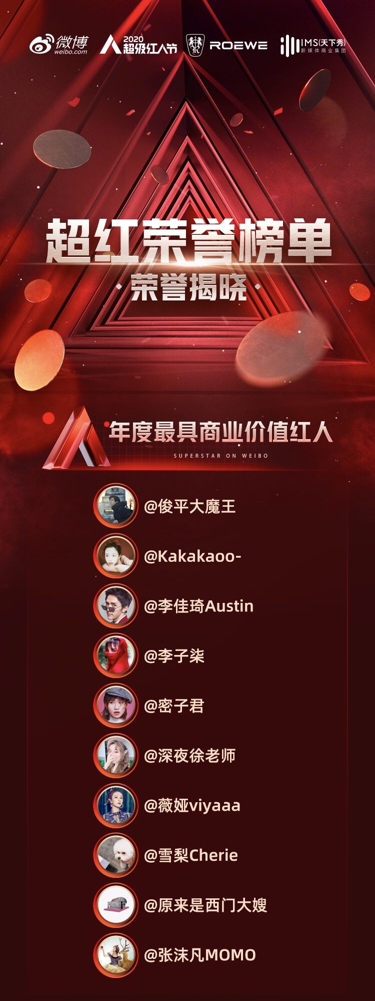 俊平大魔王、李佳琦等荣登“2020 微博超级红人节——年度最具商业价值红人榜”